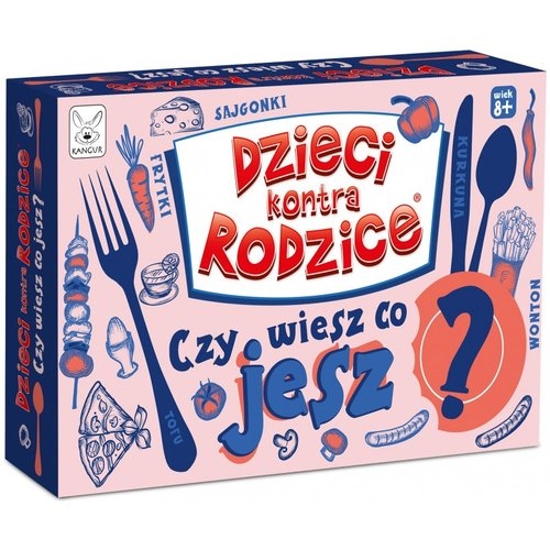 Dzieci kontra rodzice : czy wiesz co jesz? - Warszawa : Kangur, [2021]. - 1 gra (52 karty, 156 pytań, 2 karty pułapki) : karton, tektura, kolor ; w pudełku 3x17x12 cm + instrukcja (2 strony : ilustracje kolorowe ; 15 cm).