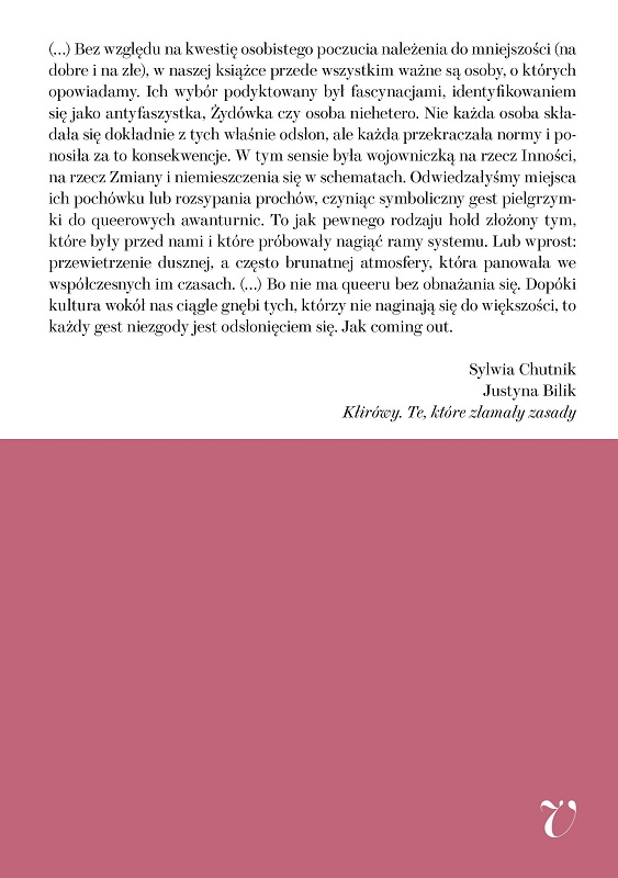 Eseje biograficzne o 15 kobietach, wojowniczkach na rzecz Inności, na rzecz zmiany i niemieszczenia się w schematach, które utorowały drogę dzisiejszym osobom queer. O osobach, którym nie da się przykleić jednej etykiety. „I tak Claude Cahun jest poza płciami, Frida Kahlo wbrew ograniczeniom cielesności, Marsha P. Johnson rozwiewa mity na temat bierności (czarnoskórej transkobiety, na dodatek pracownicy seksualnej). Lee Miller to co prawda piękna modelka, ale i zawzięta reporterka wojenna leżąca w wannie Hitlera. Virginia Woolf to ikona „sławnej pisarki”, a jednak przepełniona bólem i namiętnościami. Eve Adams to zaangażowana politycznie lesbijka, Susan Sontag intelektualistka, której nigdy nie zrozumiemy, Piotr Włast to hiperpłciowość, a znowu Natalie Clifford Barney to nie tylko dama z paryskiej bohemy, ale i aktywistka. Jest też Adrienne Rich, która raz na zawsze obala mit, że matka nie może być zarazem lesbijką, a znowu lesbijka Tove Jansson może być zarazem autorką popularnych bajek” - jak pisze we wstępie Sylwia Chutnik.